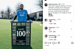 桑切斯社媒晒出与百场里程碑纪念品的合照,配文:“100场比赛!达成这一里程碑的感觉真特别,感谢一路上给予帮助和支持的每个人,喜欢与这群队友并肩作战的感觉,我已准备好迎来更多比赛。”