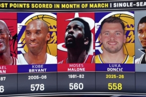 本场比赛过后,东契奇三月(当地时间)总得分达到600,是乔丹(676分)之外历史上唯一在三月份总得分600的球员。