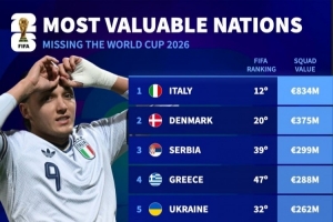 无缘世界杯球队身价排名:意大利8.34亿欧居首,丹麦3.75亿欧次席