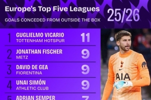 本赛季五大联赛门将禁区外失球榜:维卡里奥11球最多,德赫亚9球