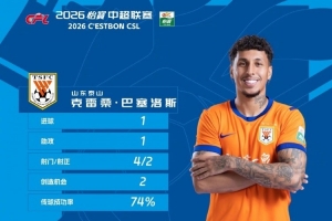 官方:克雷桑当选中超第2轮最佳球员,1传1射帮助泰山战胜国安